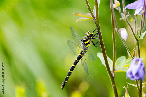 Striped dragonfly in nature. Close-up of the insect. Yellow and black striped dragonfly. Cordulegaster bidentata.