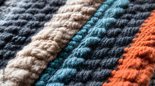 Stripes Woven Rug: A close-up shot of a colorful, striped woven rug with detailed texture. Capture the intricacies of the weaving, the blend of natural fibers, and the harmonious color palette.