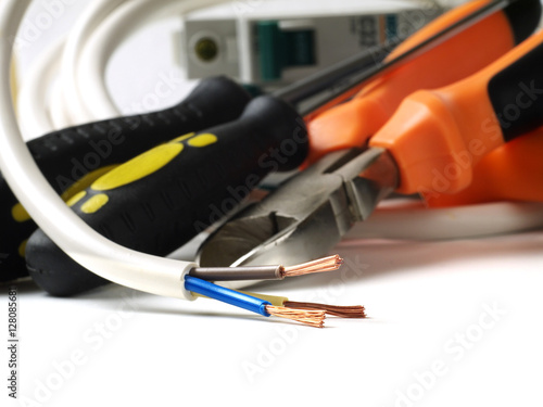 stripped wire in front of electric tools and equipment, shallow depth of field