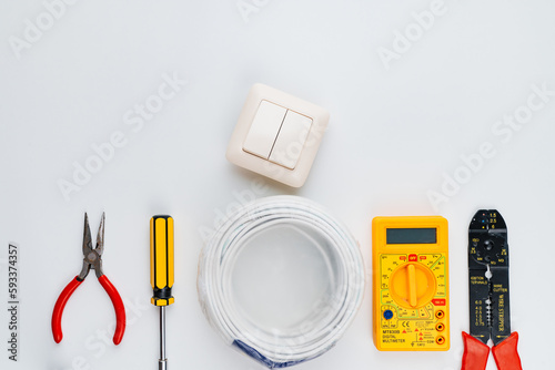 Stripper, Pliers, Multimeter, Wire, switch and Screwdriver on a white background