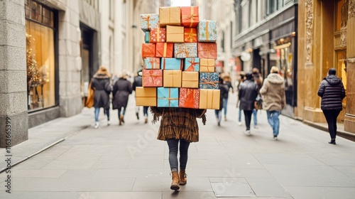 [Strolling through a city street.] Street Performer Carrying Book Stacks on Head Amidst Bustling City Life