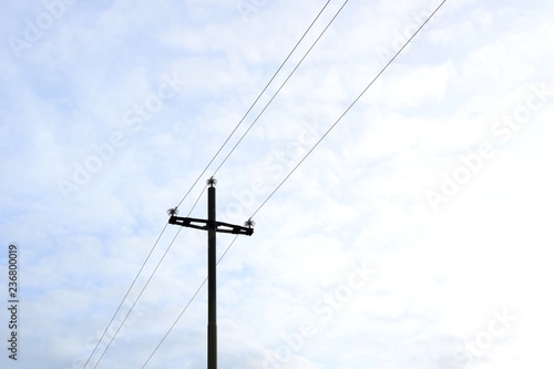 Strommast und Stromleitungen, freigestellt vor blauen Himmel