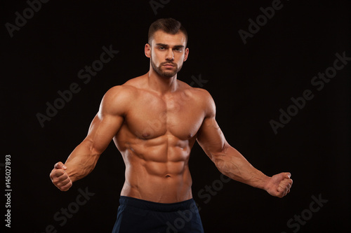 Strong Athletic Man Fitness Model Torso showing six pack abs. isolated on black background with copyspace