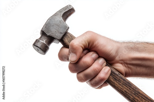 Strong hand gripping a hammer ready for construction or repair work in an indoor setting during daytime