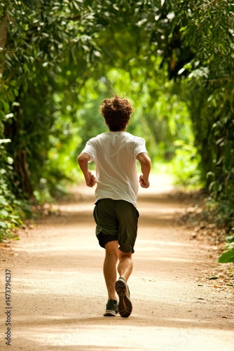 strong immunity. Fit person jogging, city park or nature trail, dynamic motion blur. Man in sportswear running away along a park path, adds speed effect, concept of fitness and energy