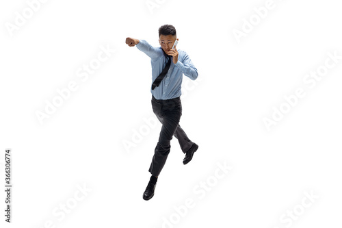 Strong. Man in office clothes practicing taekwondo on white background like professional player, sportsman. Unusual look for businessman in motion, action with ball. Sport, healthy lifestyle