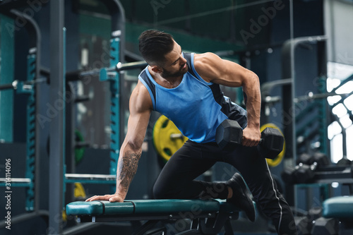 Strong man training biceps with dumbbells at gym