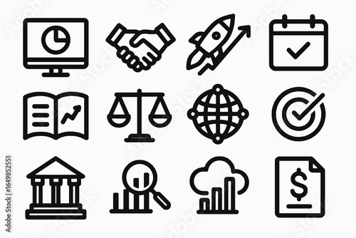 Strong thick outline business icons for strategy, finance, and global connectivity. Clean white background, perfect for dashboards, reports, and presentations
