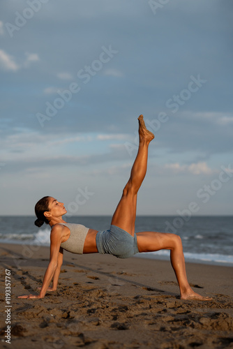 Strong Woman Performing Core Workout on the Beach in a Crab Position