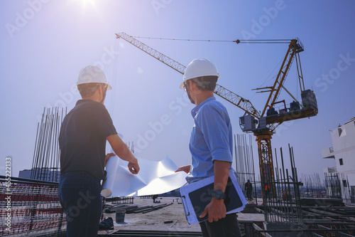 Structural engineer and foreman worker with blueprints discuss, plan inspecting for the outdoors building construction site.