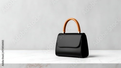 Structured minimal bag concept, Stylish black handbag with a wooden handle on a marble surface.