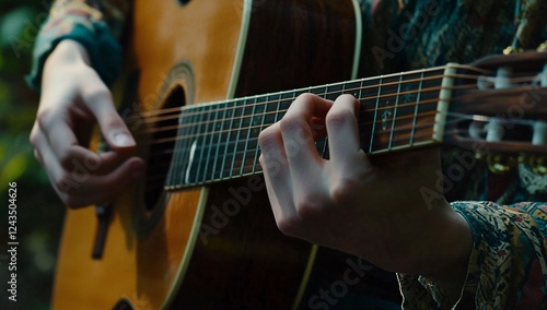Strumming acoustic guitar in a serene outdoor setting during the golden hour