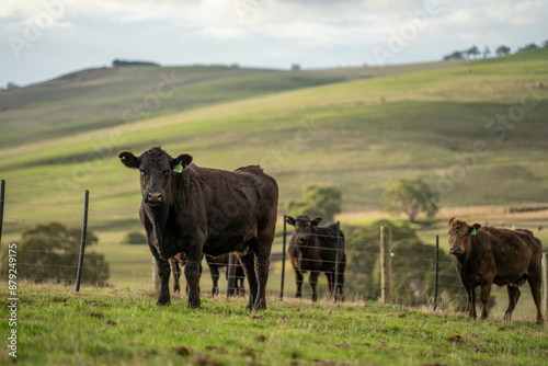 Stud beef angus and wagyu cows in a field on a farm in England. English cattle in a meadow grazing on pasture in springtime. Green grass growing in a paddock on a sustainable agricultural ranch.