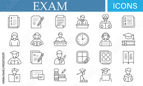 Student and Education Icons – Featuring Books, Exams, Clocks, and Graduation Symbols