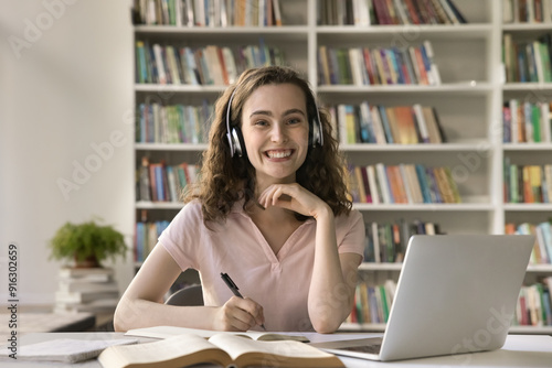 Student girl makes assignment, preparing for university admission, gain new knowledge, studying on-line, listening audio course through headphones, take part in webinar, sit at desk with modern laptop