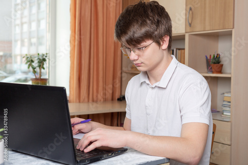 Student in glasses learning at home using laptop. Home school, online education, home education, quarantine concept