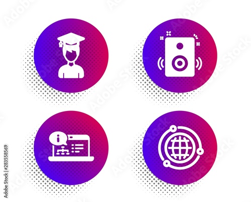 Student, Online documentation and Speakers icons simple set. Halftone dots button. Globe sign. Graduation cap, Web engineering, Sound. Internet world. Education set. Classic flat student icon. Vector
