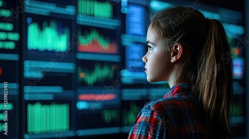 Student progress ai idea. A young girl analyzes data on modern digital screens in a tech environment.