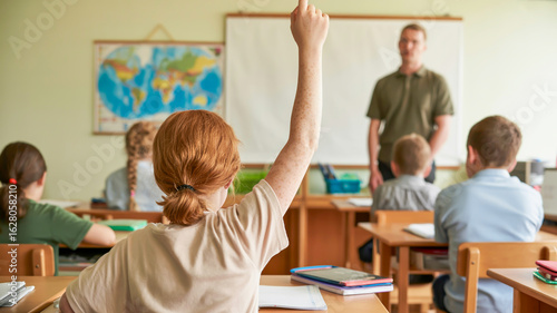 Student raising hand in classroom with teacher learning education