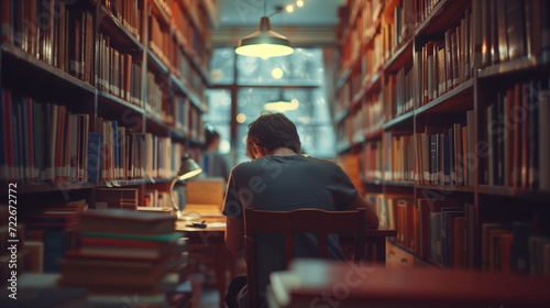 Student Studying in Library at Night A photographic style image of a serene library corner, a student deeply focused on their notes, surrounded by towering bookshelves