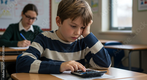 Student using calculator on desk during test in classroom, education and concentration concept
