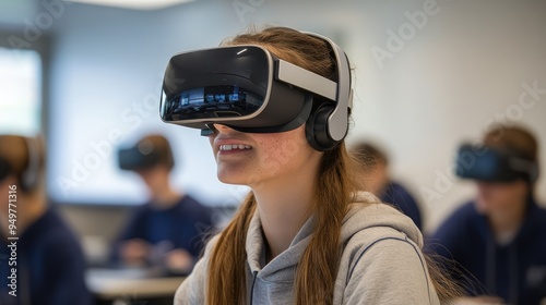 Student Wearing a VR Headset in a Classroom Using AI and Interactive Technology, 3D Illustration. AI generated illustration.
