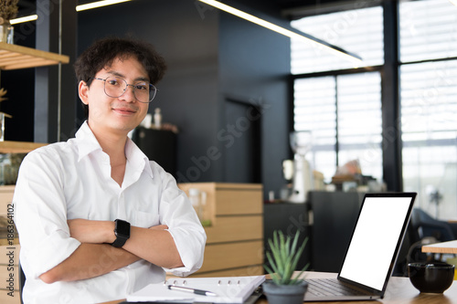 student with computer for learning leasson online at cafe. startup man working with laptop at office. young male entrepreneur smiling with arms crossed at workplace. business, education concept