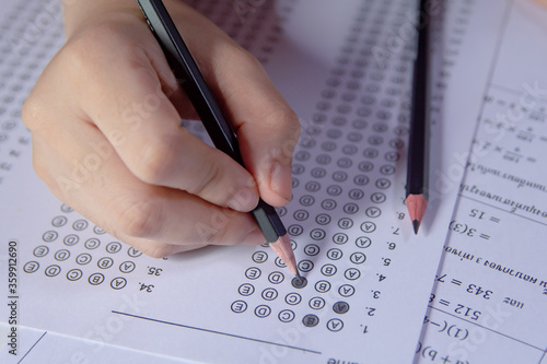 Students hand holding pencil writing selected choice on answer sheets and Mathematics question sheets. students testing doing examination. school exam.