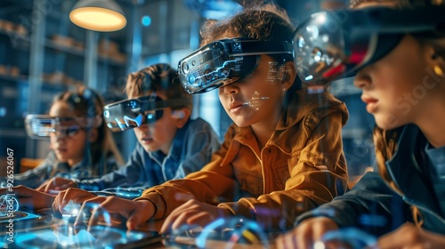 Students in a virtual classroom environment engaging with AI tutors via augmented reality tablets, with personalized learning modules displayed. Created Using: AR technology, photorealistic style,