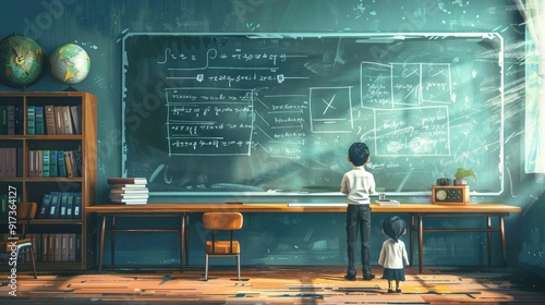 Students Learning Math Concepts in Classroom With Chalkboard and Bookshelves