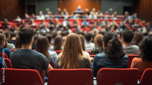 Students seated in a large lecture hall audience