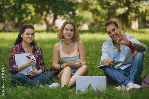 Students sit on the grass and doing their homework. Guy with a tatto shows the ok gesture. Two girl hold the notebooks. Laptop is on the grass.