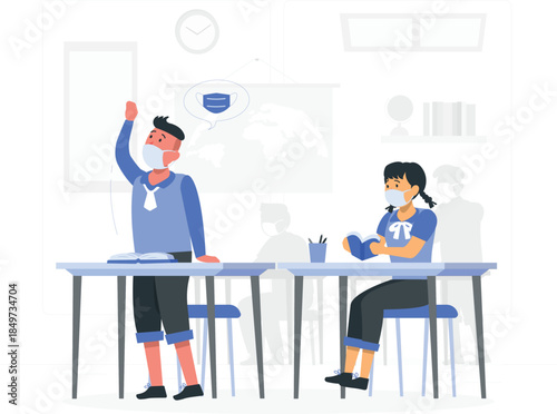 Students wearing face masks in classroom setting desks school desi