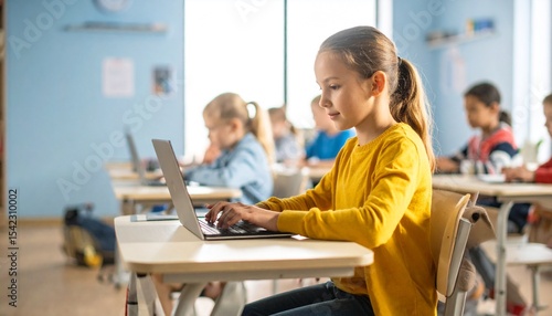 "Students working in classroom , British Girl typing on a laptop in a modest classroom"