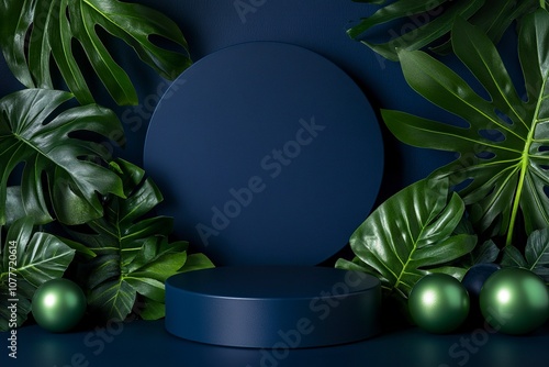 studio background in navy blue color with circular piedestal in the front, product photography, green levitatin balls background, generative ai