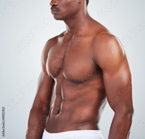 Studio, bodybuilder and torso of man in underwear with fitness progress, abs and body shape. Power, strength and male model with stomach muscle development, growth and self care on white background
