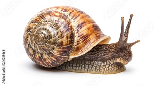 Studio close-up of a snail with its beautiful brown and white patterned shell