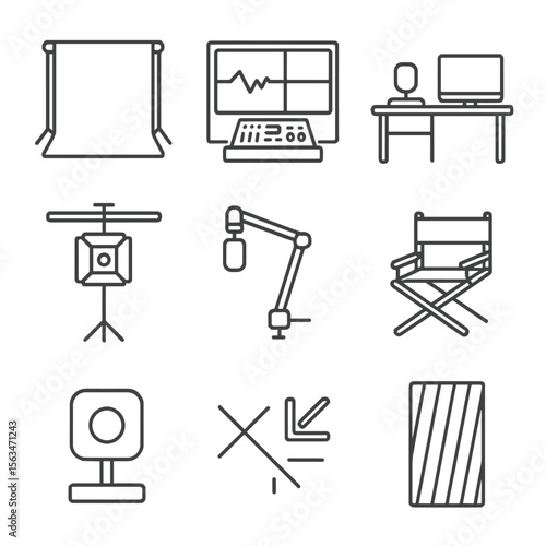 Studio Layout Icons. Line style icons of studio layout and space: green screen background, control room window, desk setup with