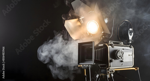 studio light and smoke on black background and old camera film, retro equipment, cinema, entertainment, film, image