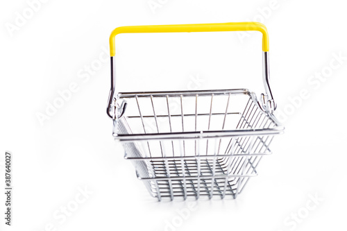 studio lighting. toy metal basket for products. On white background. Close-up.