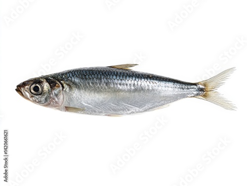 Studio photo of a single sardine with sleek texture, isolated on white, great for stock images and seafood advertisements.