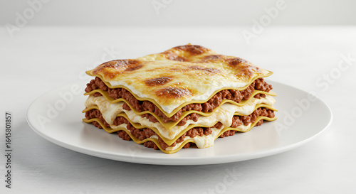 Studio photo of lasagna with bolognese sauce, layers of pasta, cheese, and béchamel, served on a white plate, white background