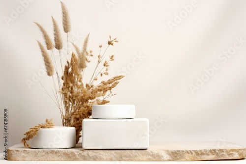 Studio photo of white flower and square podiums on white background