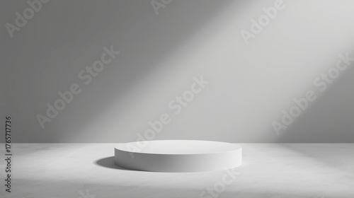 Studio photo with smooth gradient background and soft shadow falloff, featuring blank pedestal platform in center. Neutral gray tone, elegant lighting setup emphasizing shape and texture.