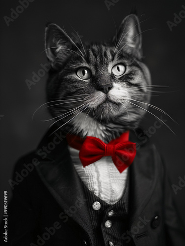 Studio portrait of a cat in a tuxedo and a red bow tie. A cat in human clothes looks at the camera. Dark background.