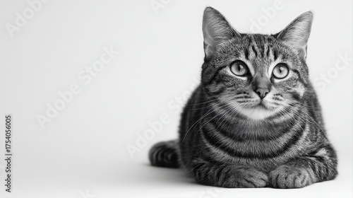 Studio portrait of a sitting tabby cat looking forward against a white back ground