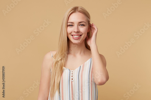 Studio portrait of young blonde woman posing over beige background touching her hair and smiling