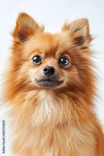Studio portrait photo of a Pomeranian Spitz on a white background. Close-up, frontal view
