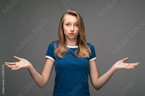 Studio shot of a clueless young woman shrugging shoulders. Concept of doubt, uncertainty and confusion