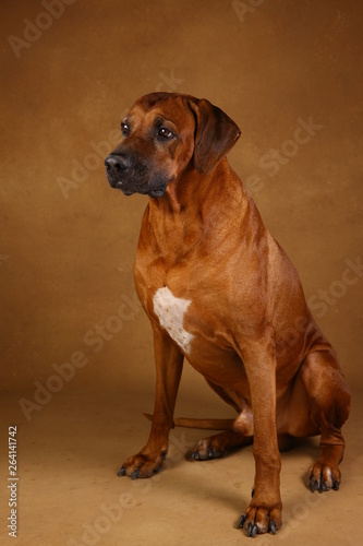 Studio shot of a Rhodesian Ridgeback Dog on brown Background